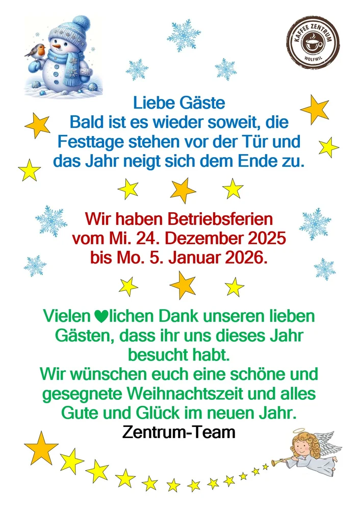 | So. 21.12 | Kalbsgeschnetzeltes „Züri Art“ mit Röstikroketten und Gemüsegarnitur, dazu ein feines Dessert | 35.50 | |